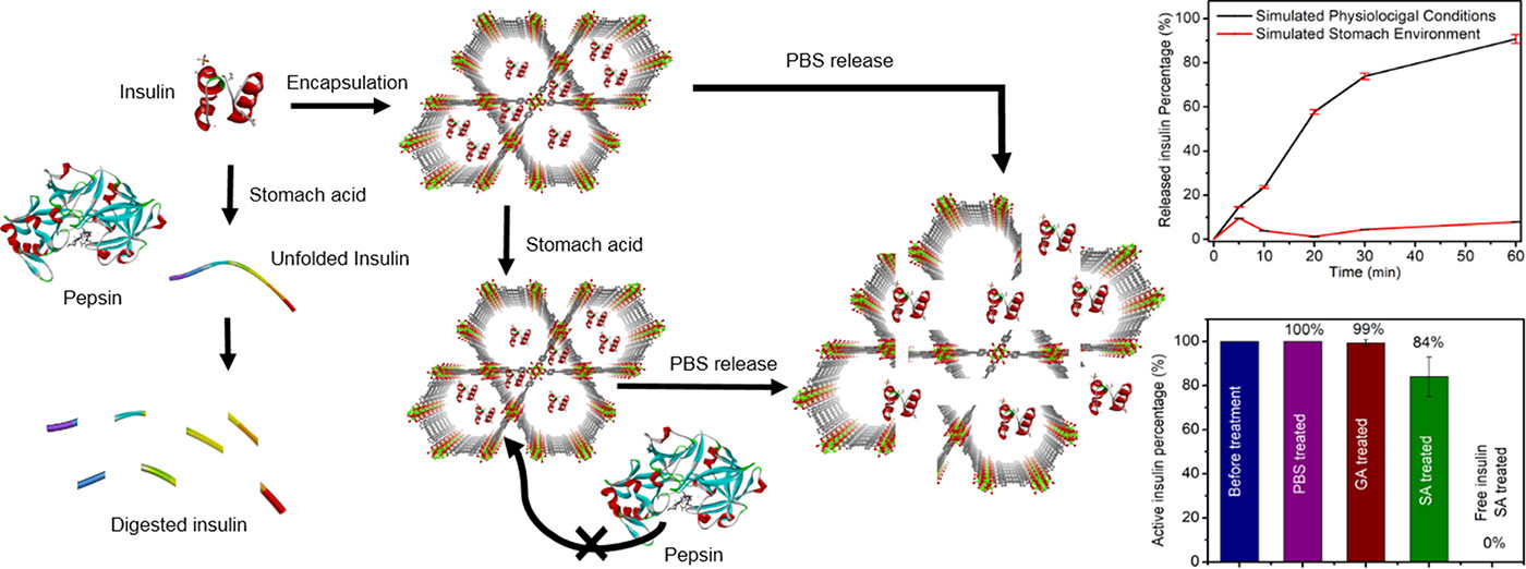 The authors from Northwestern University (USA) and King Abdulaziz University (Saudi Arabia) developed a zirconium-based mesoporous metal-organic framework (MOF) NU-1000 with acid resistance, high porosity, and controlled degradation properties, achieving high insulin loading, effective protection, and targeted release in oral insulin delivery application.