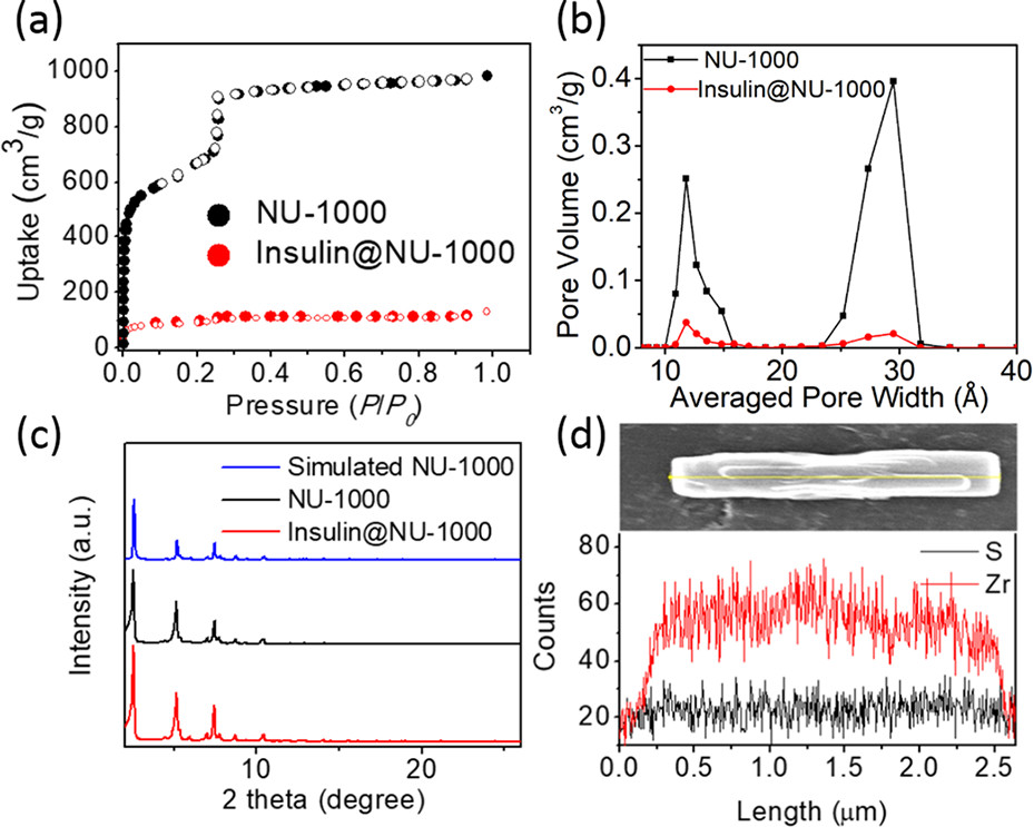 1.Synthesis: The authors synthesized and activated MOF NU-1000 according to a reported procedure; then soaked 2 μm-long NU-1000 crystals in 4×10⁻⁴ g/L insulin aqueous solution (pH 4) at room temperature for 30 min, followed by filtration and washing to prepare insulin@NU-1000 composite.
