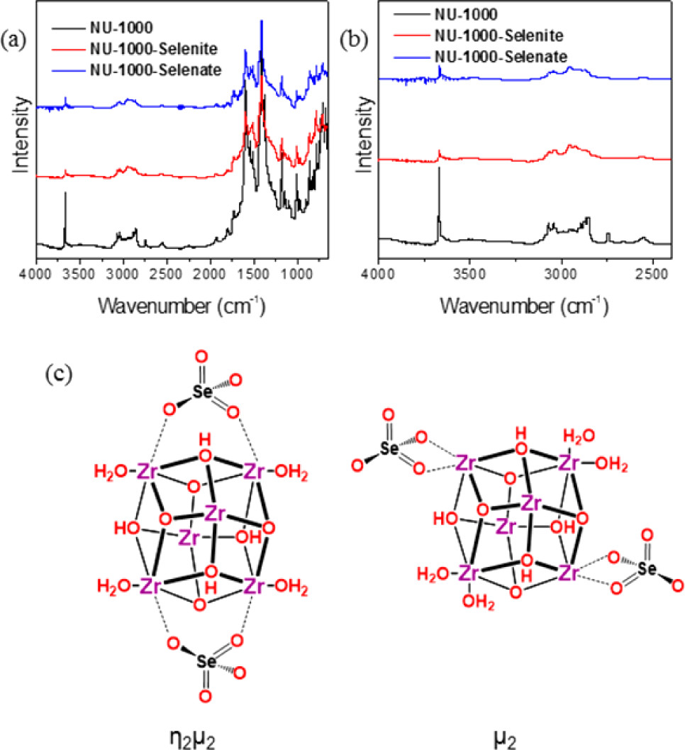 4.Mechanism: Selenate/selenite bound to Zr₆ nodes via η₂μ₂ mode, replacing terminal -OH; large pores of NU-1000 accelerated diffusion.