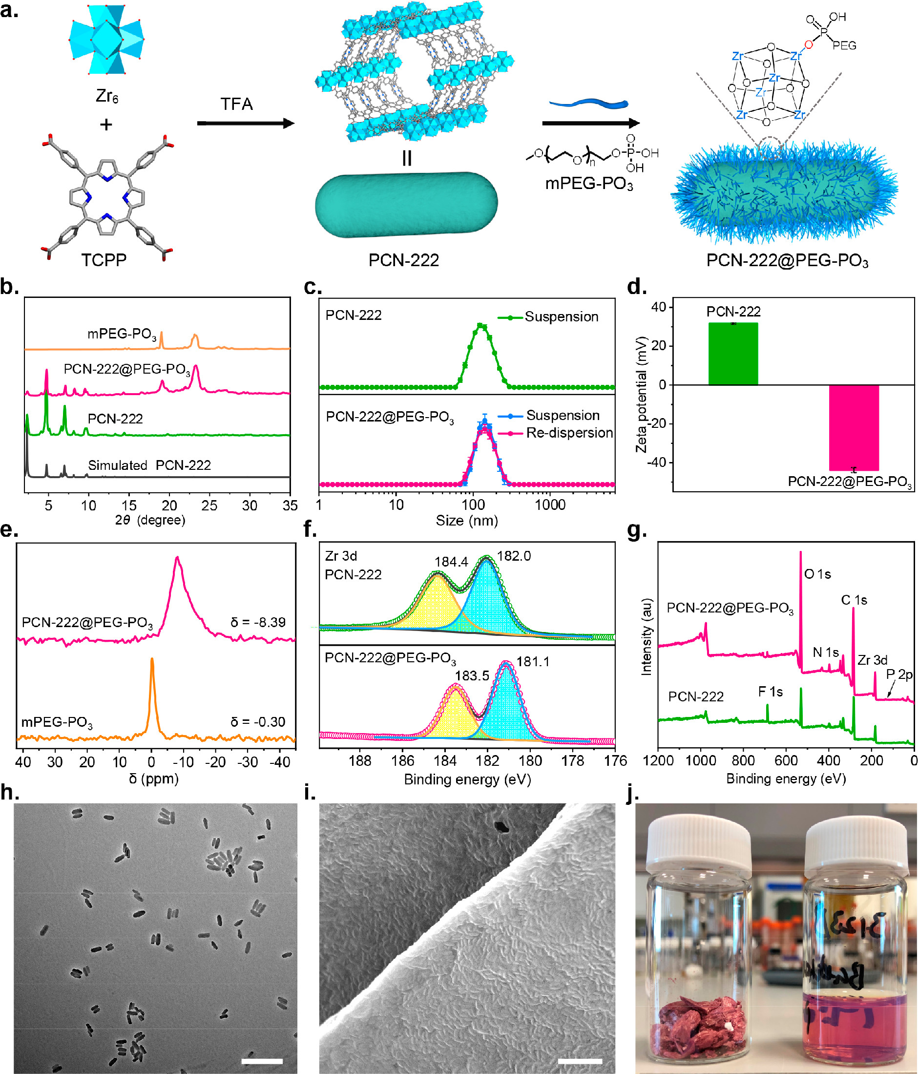 -XPS: Zr 3d peaks of PCN-222 shifted from 184.4/182.0 eV to 183.5/181.1 eV after PEGylation, indicating Zr−O−P coordination; P 2p peaks confirmed mPEG−PO₃ incorporation.
