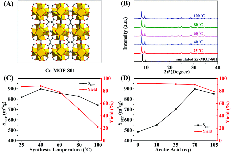 -Ce-MOF-801 synthesis: Using water as solvent, fumaric acid (FUM) as ligand, and Ce(NH₄)₂(NO₃)₆ as Ce source, the authors synthesized Ce-MOF-801 via aqueous-phase reaction. They optimized conditions: reaction temperature 40 °C, reaction time 6 h, and 70 eq acetic acid (HAc) as modulator. For rapid separation, it could also be synthesized at 25 °C in 10 min.
