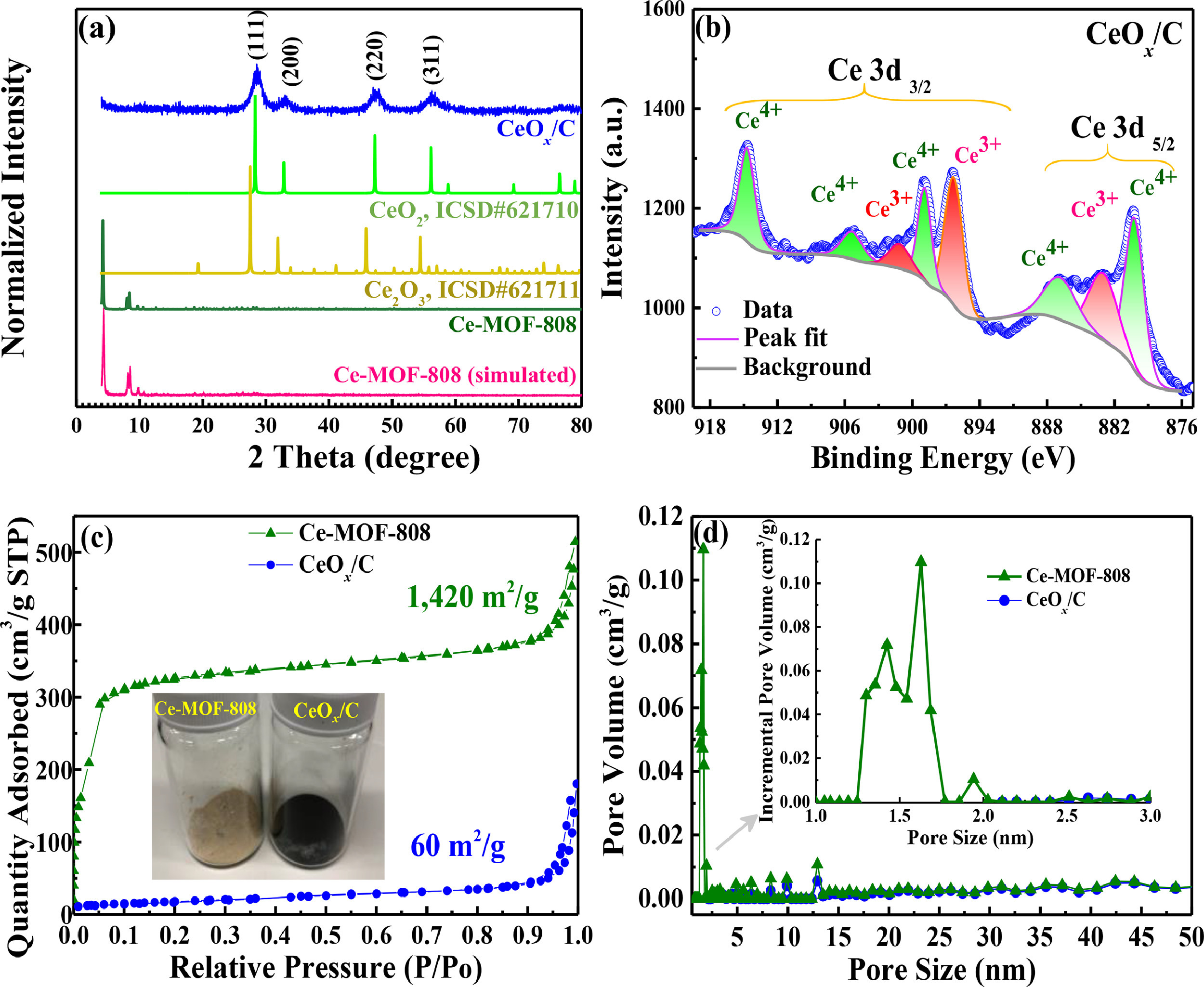 1) BET surface area decreased from 1420 m²/g (Ce-MOF) to 60 m²/g (CeOx/C), with preserved macroporosity.