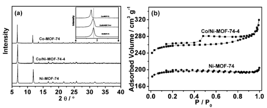 XRD tests: Ni-MOF-74, Co/Ni-MOF-74-4 and Co-MOF-74 had similar XRD patterns, indicating Co/Ni-MOF-74 retained Ni-MOF-74 framework; the 2θ peak at ~6.8° of Ni-MOF-74 shifted to lower value in Co/Ni-MOF-74-4. Fresh and used Co/Ni-MOF-74-4 had similar XRD patterns, showing good stability.