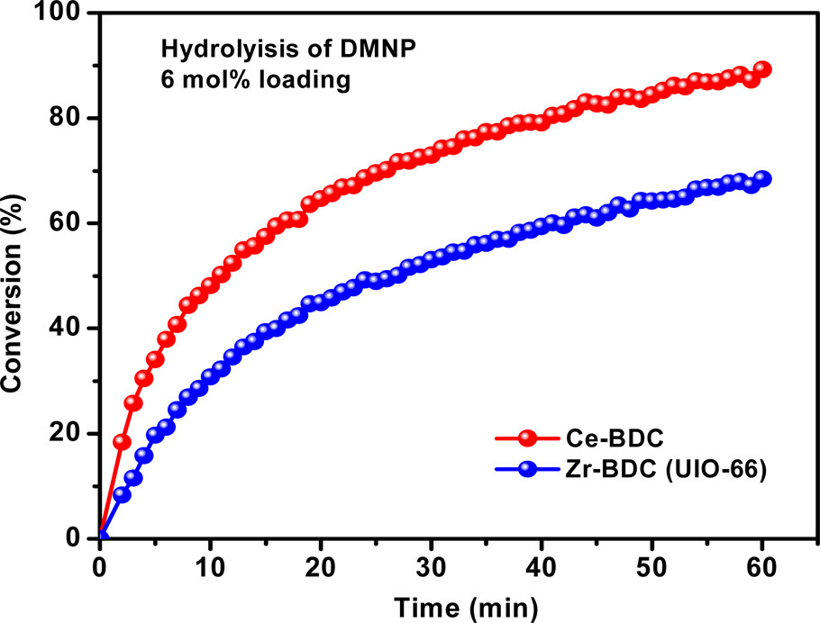 - In N-ethylmorpholine buffer (pH 10), Ce-BDC reduced DMNP half-life from 19 min (UiO-66) to 8 min.