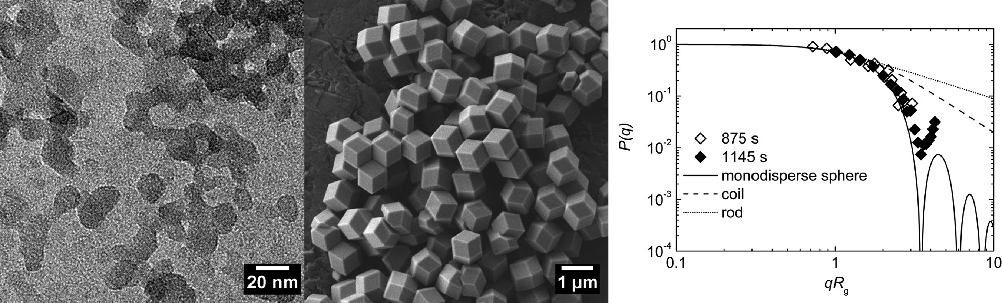 - SAXS: 65 nm nanocrystals (polydisperse spheres, radius 44 nm, polydispersity 0.28); 18 nm nanocrystals (primary size 18 nm, Rg=27 nm).