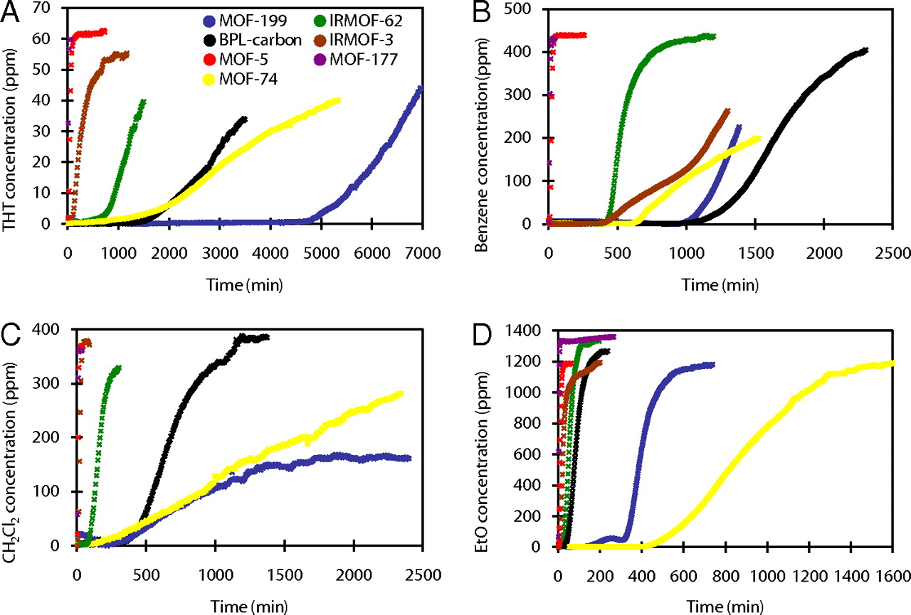 The authors from Department of Chemistry and Biochemistry, Center for Reticular Materials Research at California NanoSystems Institute, University of California, Los Angeles : developed six benchmark MOFs/IRMOFs with tunable pore functionality and high surface area, achieving excellent dynamic adsorption performance for harmful gases/vapors.