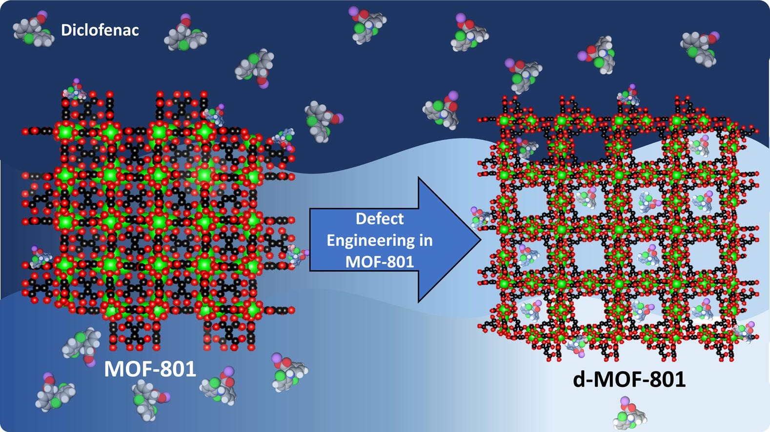 The authors from Imperial College London developed defective MOF-801 (d-MOF-801) with adjustable defects, high specific surface area, and excellent adsorption capacity, achieving a maximum diclofenac adsorption capacity of 680 mg/g in water pollutant removal.