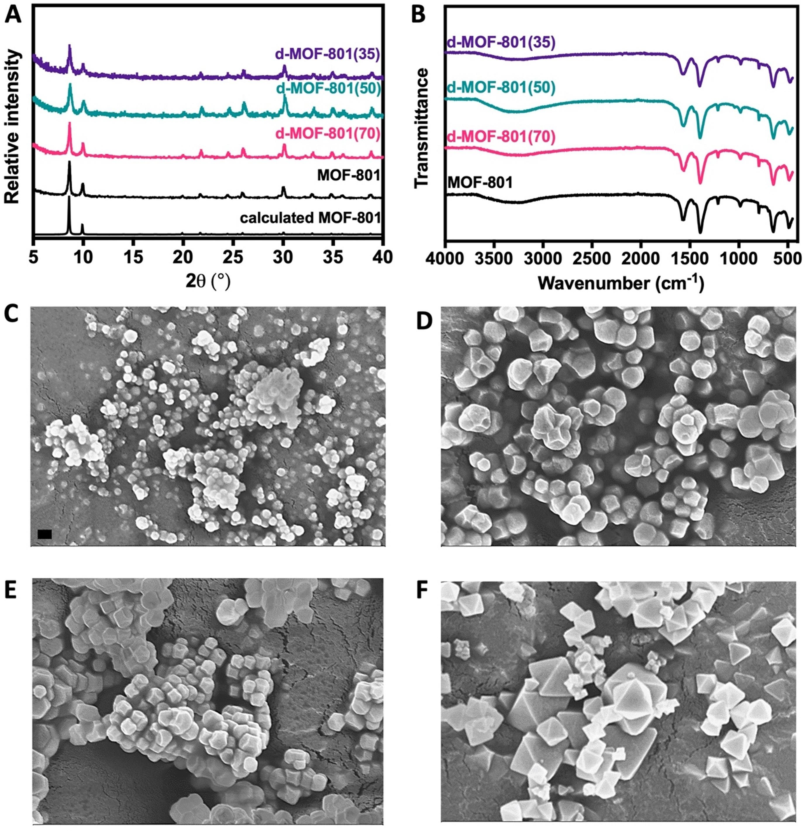 2) SEM: d-MOF-801 was spherical (<200 nm), MOF-801 was octahedral (~500 nm).
