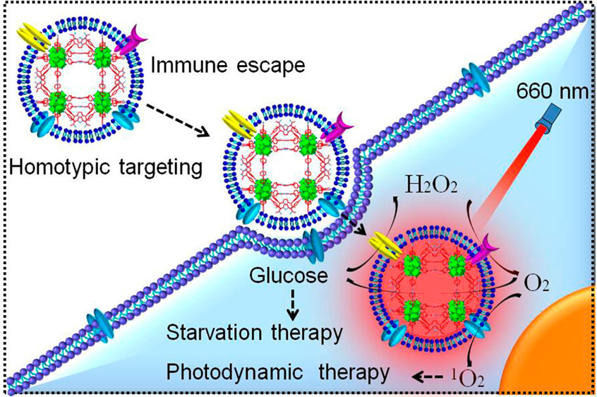 2. The authors proposed a strategy of camouflaging porphyrin metal-organic framework (PCN-224) loaded with glucose oxidase (GOx) and catalase with cancer cell membrane, constructing mCGP to achieve synergistic starvation therapy and PDT with enhanced targeting and therapeutic efficiency.