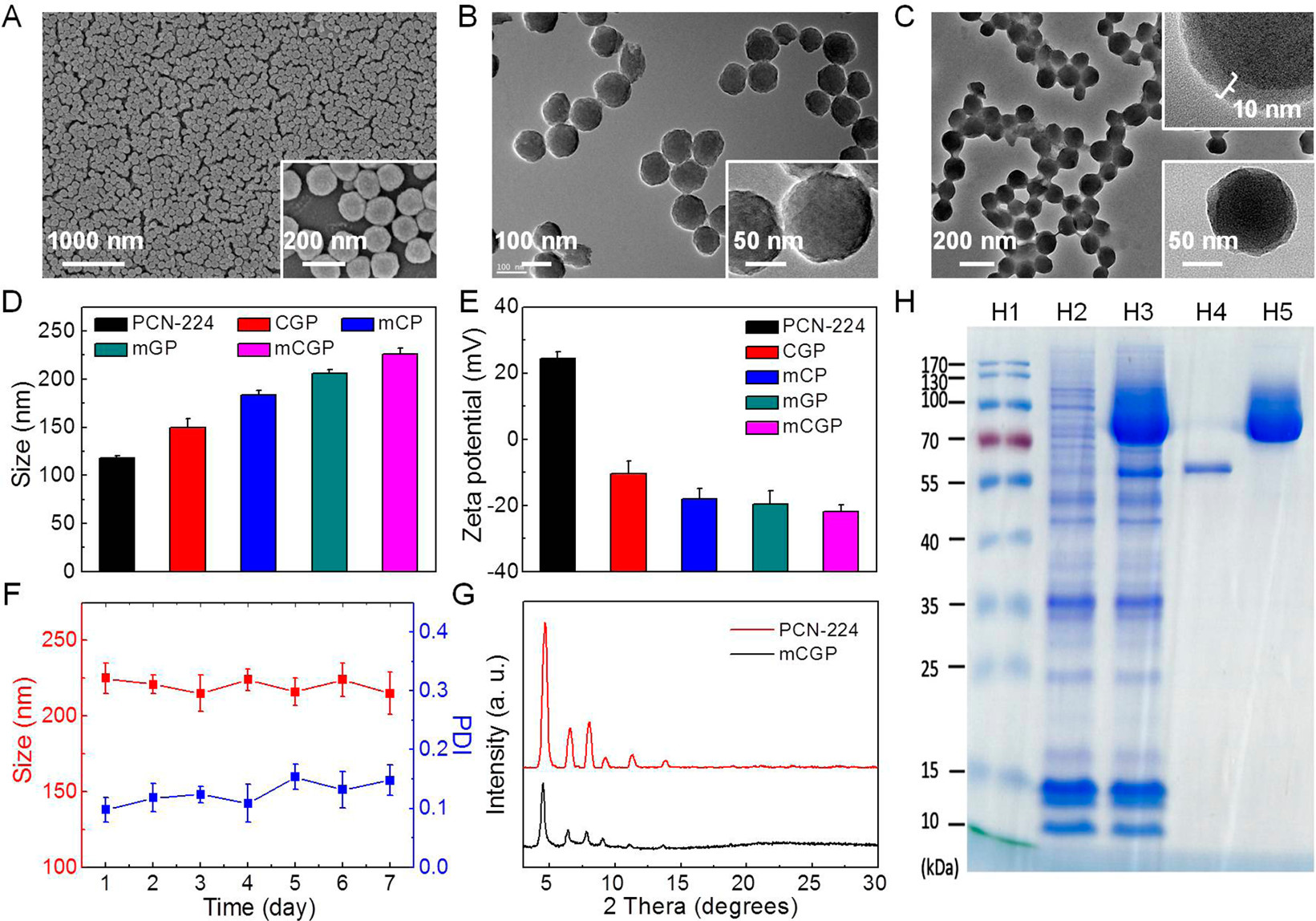 2) SEM/TEM tests show that PCN-224 has a monodispersed size of about 105 nm, and mCGP has a core-shell structure with a uniform outer lipid bilayer shell of about 10 nm and a hydrodynamic size of about 227.5 nm.