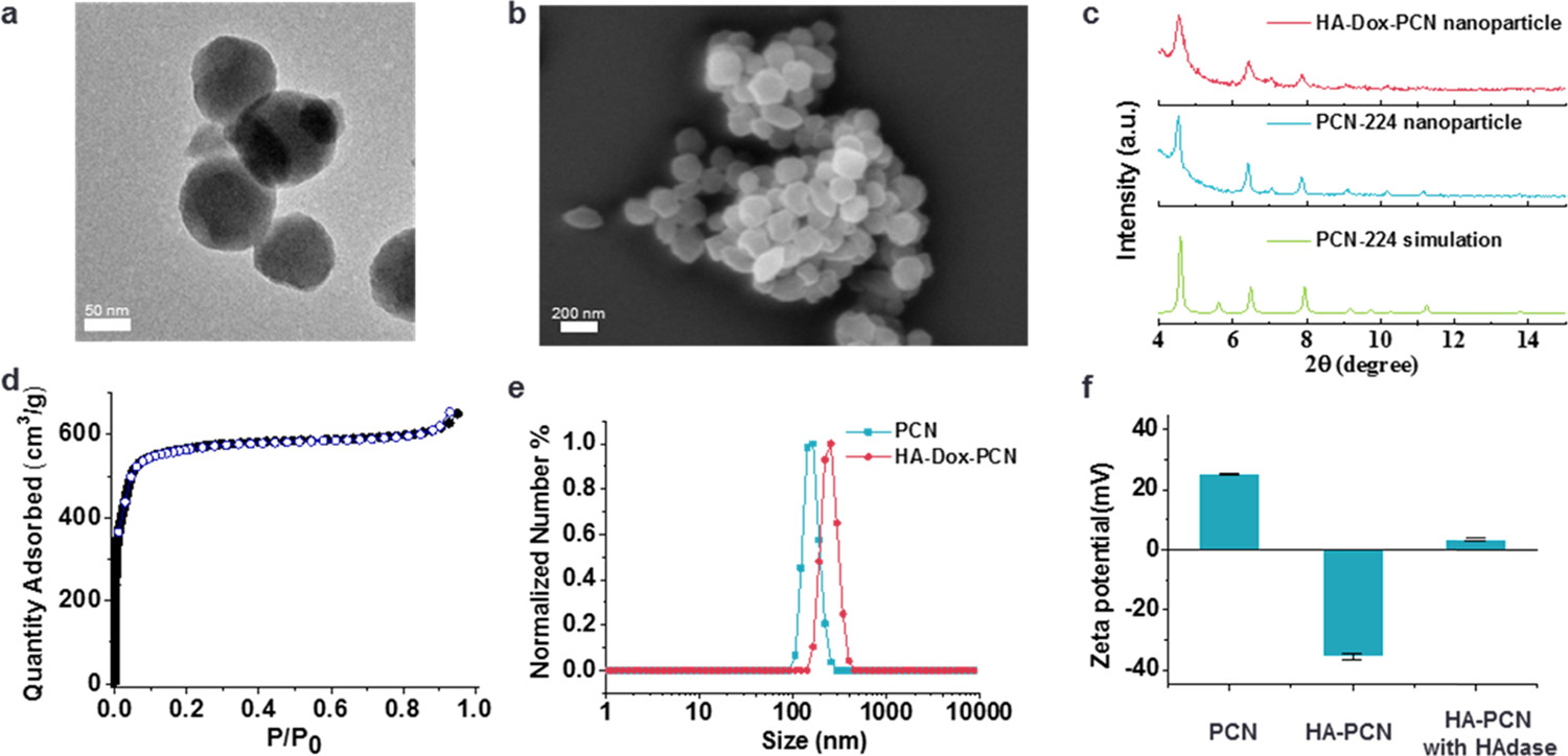 2) SEM/TEM tests show PCN-224 and HA-Dox-PCN have spherical morphology, particle size ~90nm; DLS shows HA-Dox-PCN hydrodynamic radius ~250±20nm.