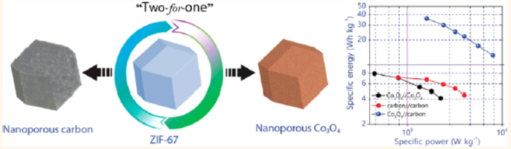 The authors from National Institute for Materials Science (NIMS), Waseda University, etc. developed **nanoporous carbon and nanoporous Co₃O₄** with high specific surface area, good conductivity, and 3D porous structure, achieving excellent performance in asymmetric supercapacitor energy storage applications.