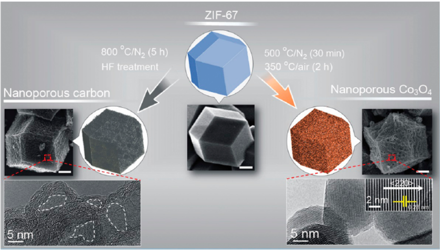 - Nanoporous carbon: ZIF-67 was carbonized at 800℃ in N₂ for 5 h, followed by HF treatment to remove Co nanoparticles.