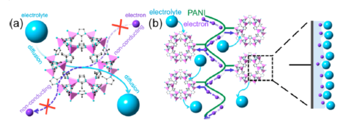 - PANI acts as electron transport bridges, improving MOF conductivity and wettability, enabling electrolyte access to MOF internal surfaces.
