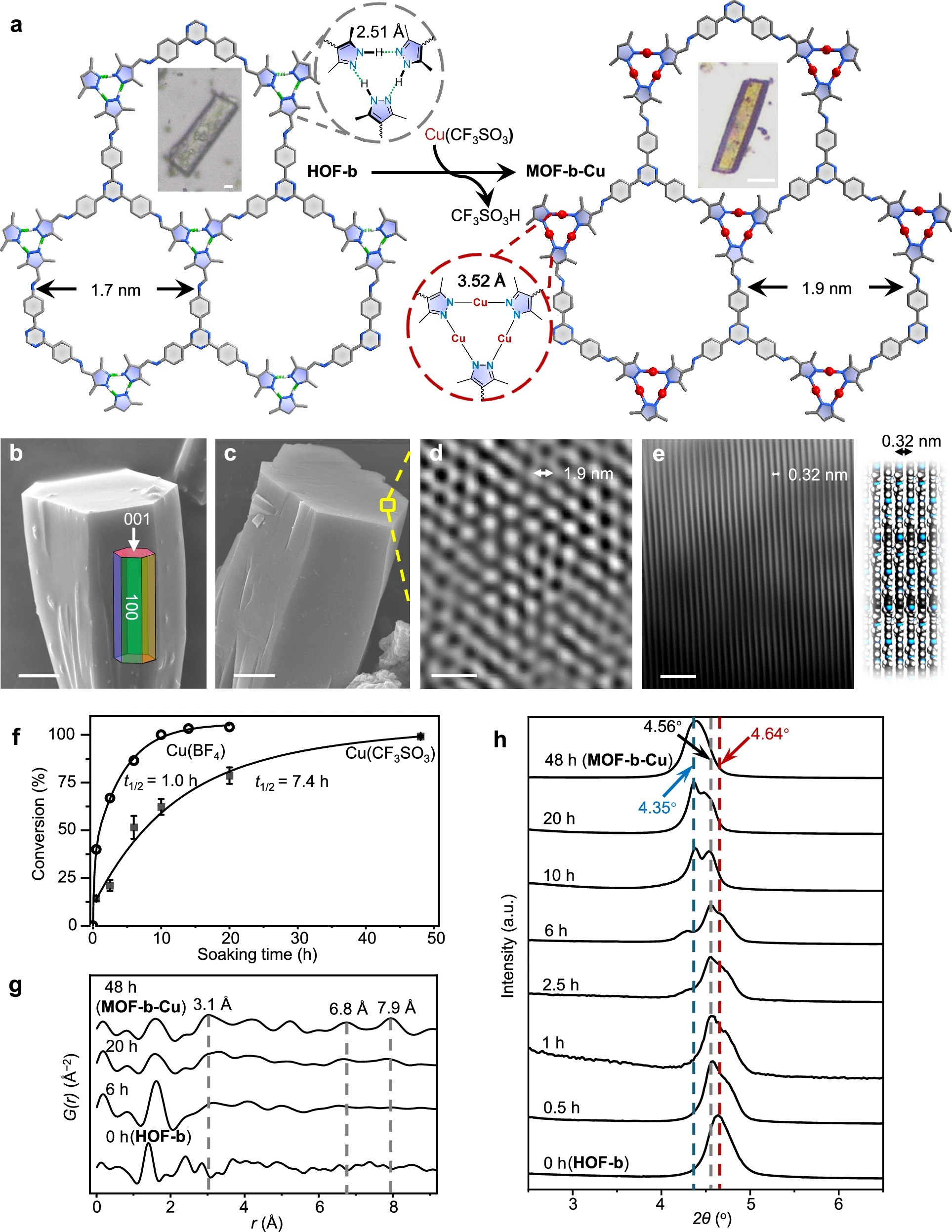 The authors synthesized HOF-a and HOF-b via Schiff-base reaction; prepared MOF|HOF|MOF heterostructures by soaking rod-shaped HOF-b single crystals in Cu(CF₃SO₃) methanol solution at 298 K, with metalation time controlled (0.5-48 h) to adjust domain distribution.
