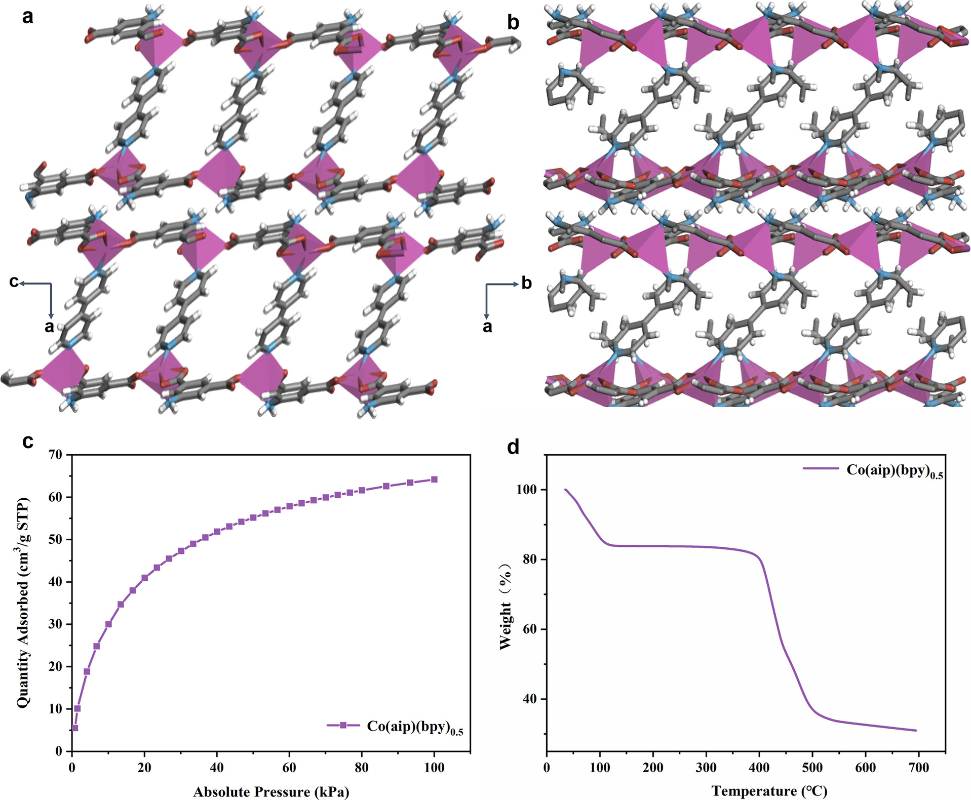 1. Synthesis: Solvothermal reaction of Co(CH₃COO)₂·4H₂O, 5-aminoisophthalic acid and 4,4′-bipyridine in MeOH/H₂O at 60 °C for 72 h, followed by methanol exchange and 150 °C activation.