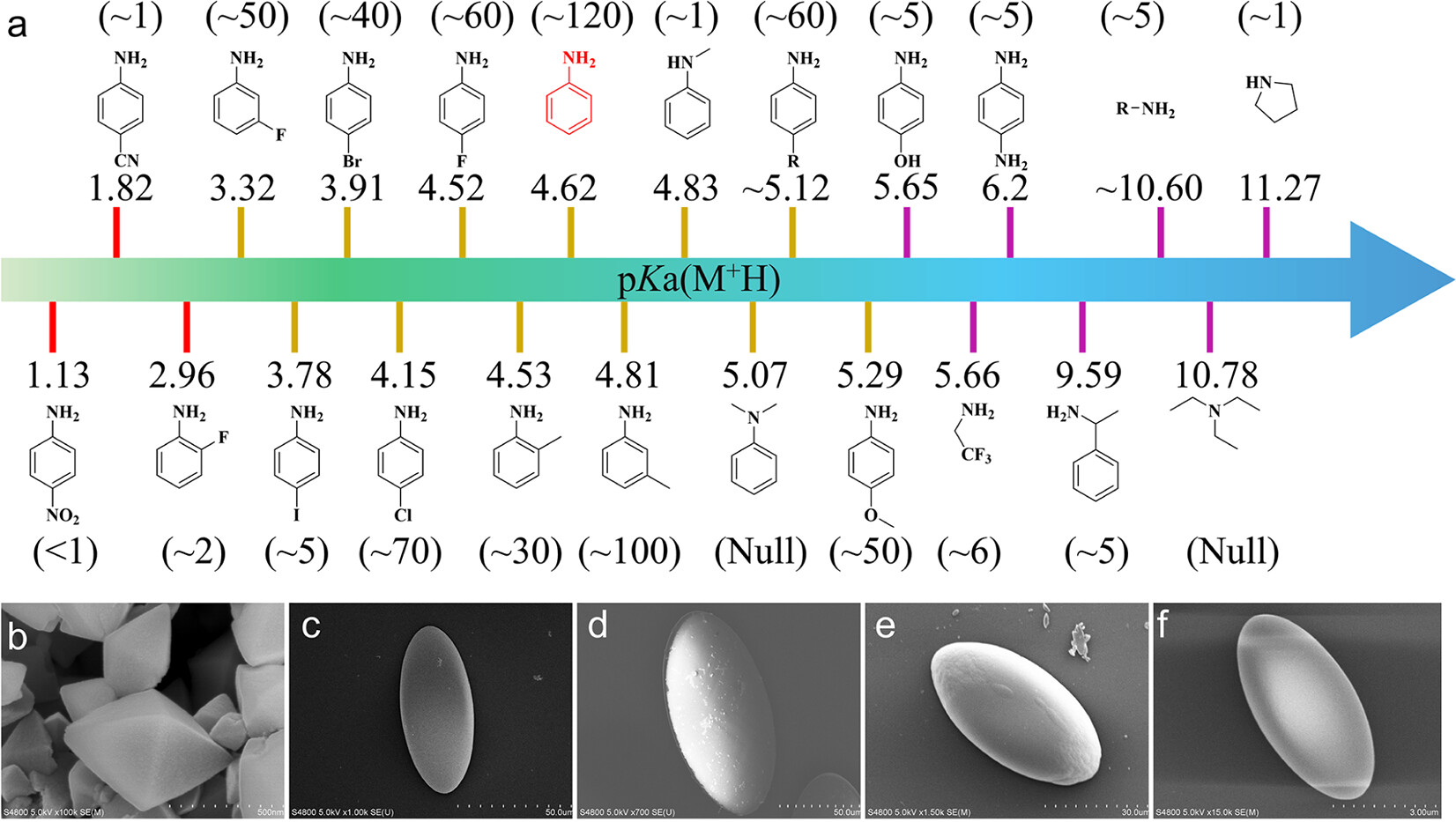 4. Mechanism: Acetal slowly releases aldehyde → homogeneous supersaturation; compatible aromatic amines (pKa 3.3–5.3) cap [010] face, decouple nucleation/growth; ML model (KELM-BES) accurately maps acid/aniline dosage → crystal size/shape.