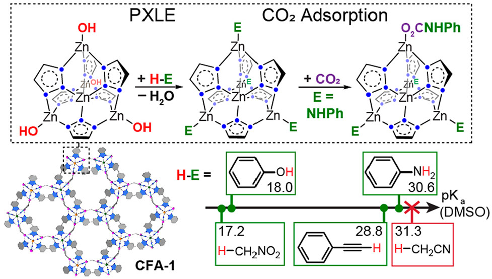 2. The team introduced postsynthetic X-type ligand exchange (PXLE) to replace Zn–OH with Zn–NHPh, creating stronger nucleophilic sites while preserving framework integrity.