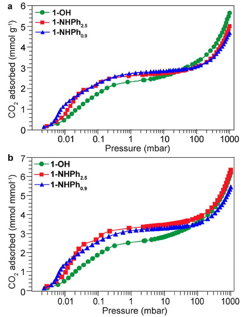 3. Application: 1-NHPh2.5 gives 3.31 mmol mmol⁻¹ CO₂ at 1 mbar vs 2.58 for 1-OH; 2-NHPh shows 0.95 mmol g⁻¹ and 65 kJ mol⁻¹ Qst—stable over 5 cycles.