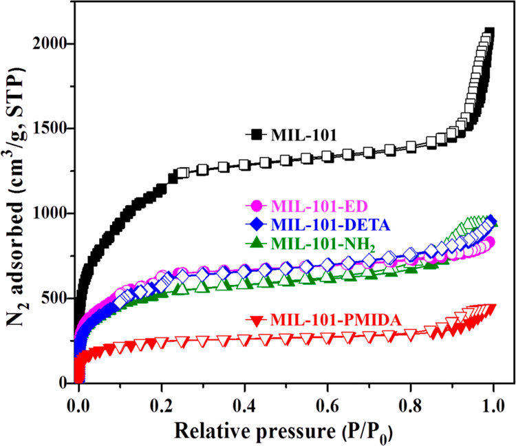 1.Synthesis: Prepared MIL-101, MIL-101-NH₂, MIL-101-ED, MIL-101-DETA, and MIL-101-PMIDA using ligands like H₂BDC, H₂BDC-NH₂, and PMIDA, via mixing, heating, refluxing, filtration, and drying.