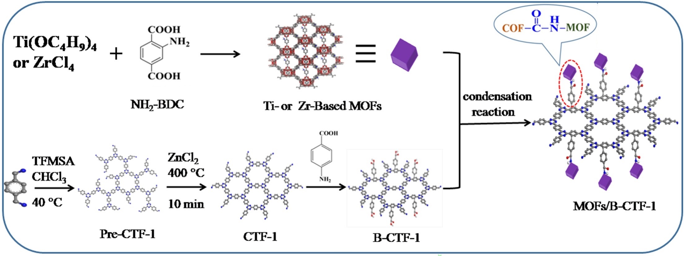 2. The authors proposed postsynthetic covalent modification to anchor NH₂-MIL-125(Ti) or NH₂-UiO-66(Zr) on benzoic-acid-grafted CTF-1, obtaining robust amide-bonded hybrids.