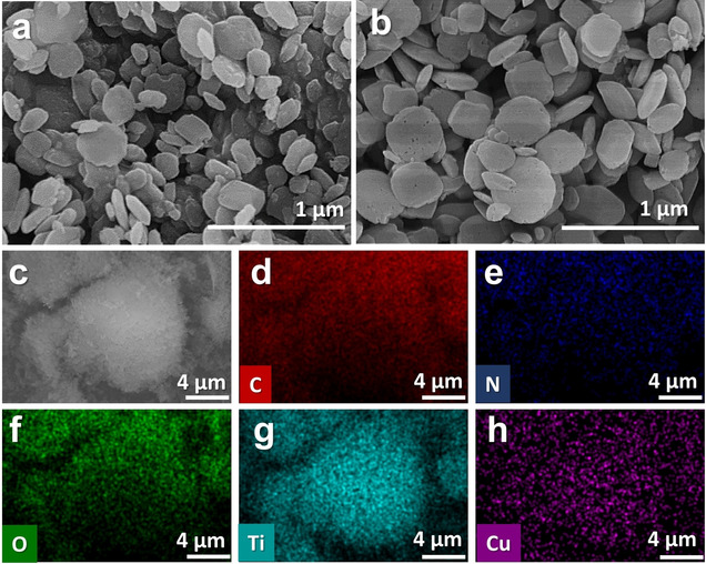 2) SEM/TEM show intact 200–300 nm disk morphology; EDX mapping reveals homogeneous Cu dispersion (0.90 wt %).