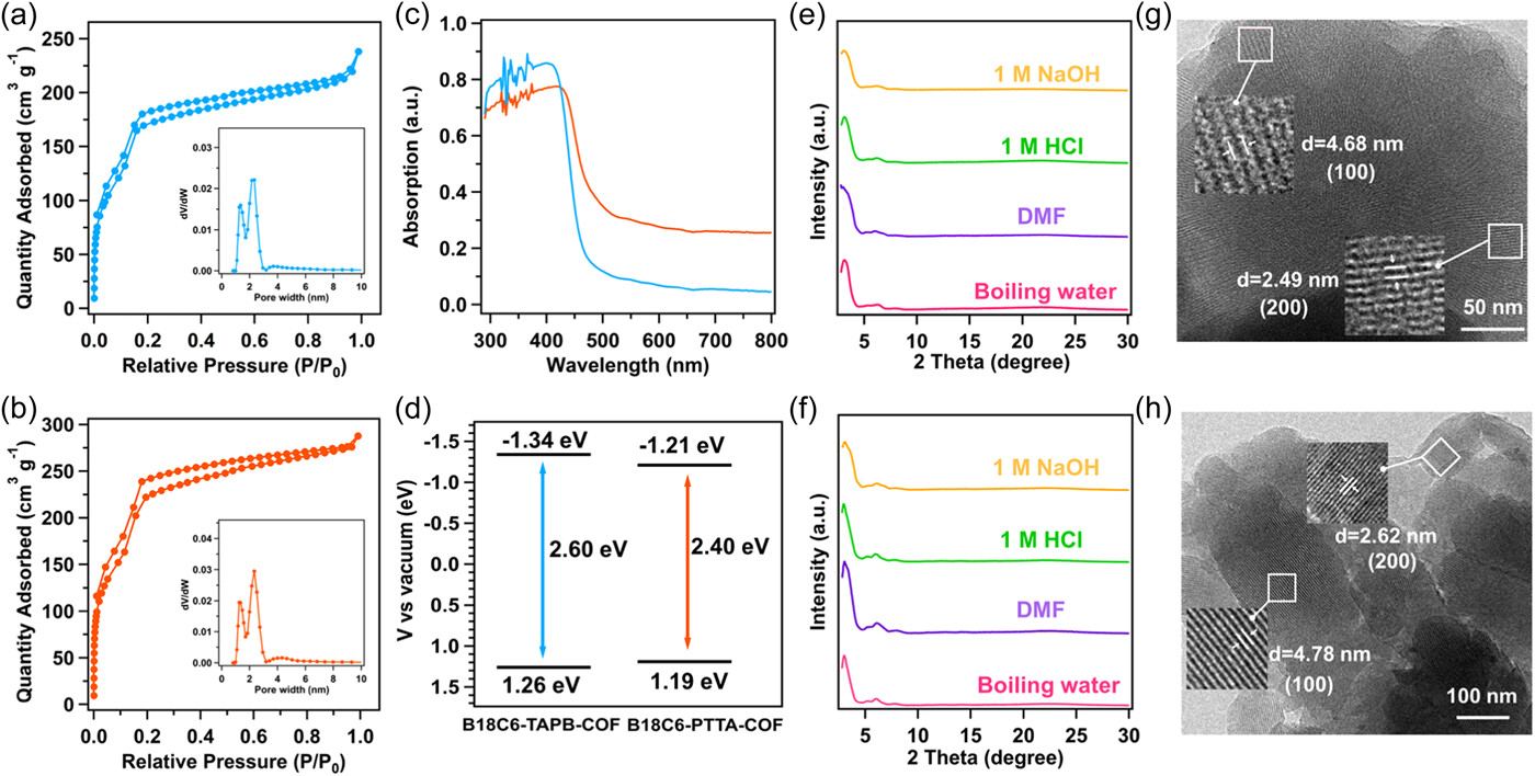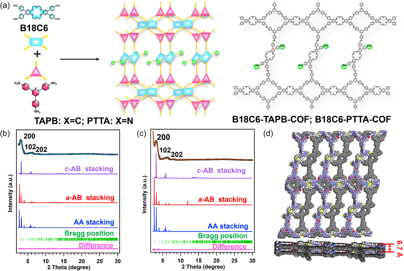 The authors synthesized two COFs (B18C6-TAPB-COF and B18C6-PTTA-COF) by Schiff-base condensation of a crown-ether tetraaldehyde (B18C6) with triangular amines TAPB or PTTA under solvothermal conditions.