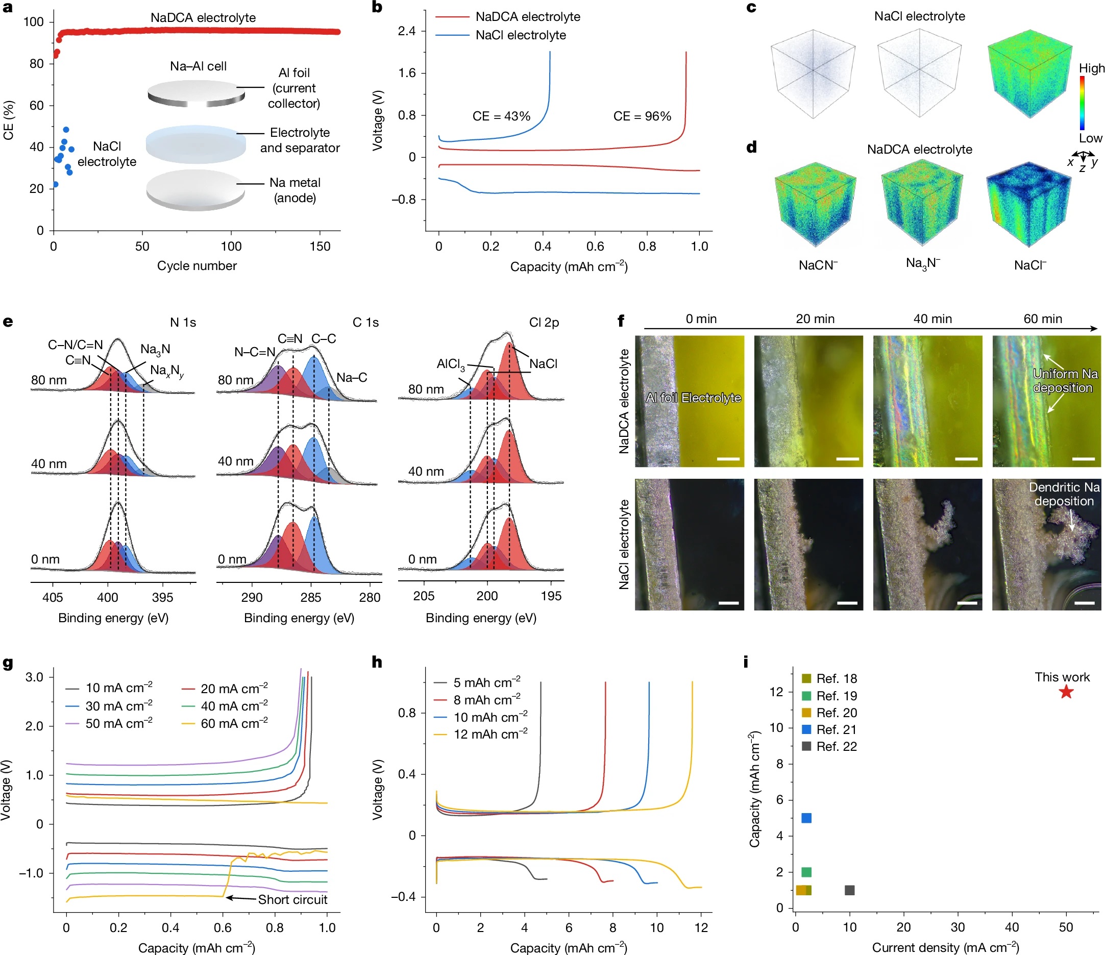3) Operando XRD, Raman, XAS, GC-HRMS verify reversible S₈ ↔ SCl₄ (32 e⁻) with SCl₂/S₂Cl₂ intermediates; TOF-SIMS depth profiles reveal N-rich SEI (NaCN, Na₃N) that enables 96 % Na plating CE.